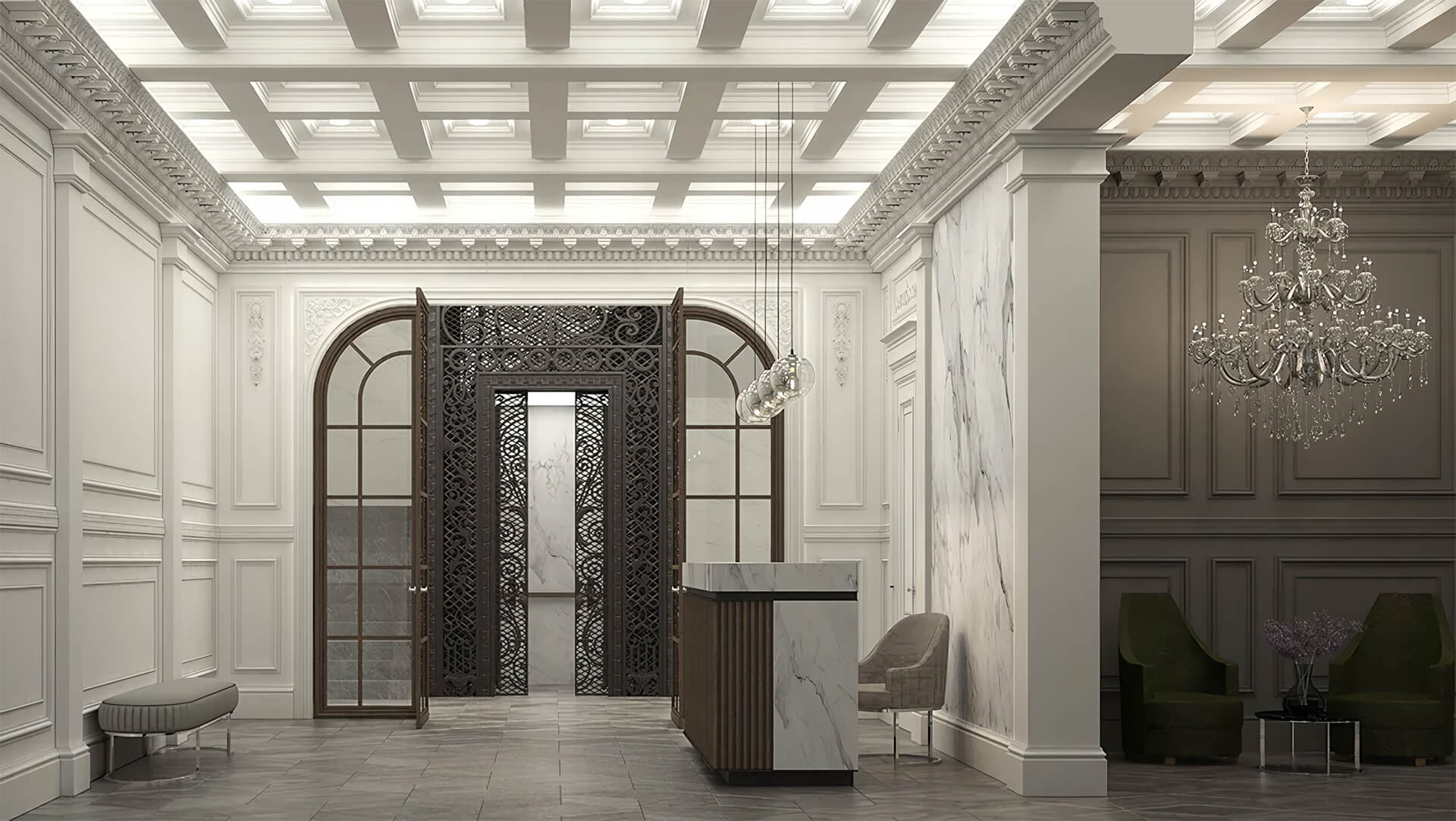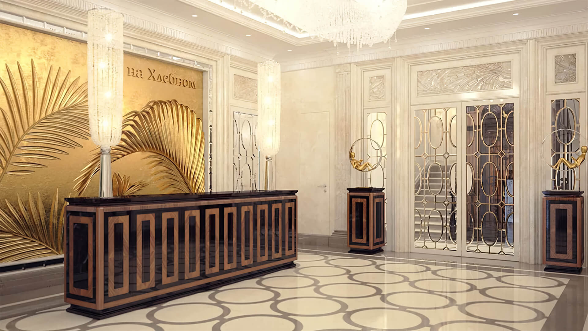 Лобби «Дома на Хлебном» — это пространство, где стиль и функциональность дополняют друг друга. Интерьер выполнен в светлых тонах, с использованием натурального мрамора, гранита и ценных пород дерева. Центральным элементом является стойка рецепции из подсвеченного алебастра. Просторные зоны ожидания оснащены дизайнерской мебелью и современными светильниками. Внимание к деталям делает лобби не только представительским, но и уютным местом для встречи гостей или отдыха.